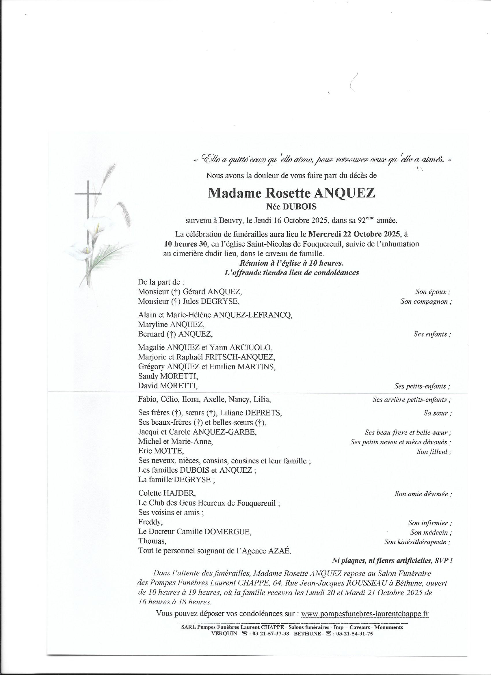 THELLIEZ LAURENT sur 19 octobre 2025 à 12 h 56 min Sincères condoléances à toute la famille et aux proches. Courage à tous dans cette épreuve. Que Rosette repose en paix Réponse