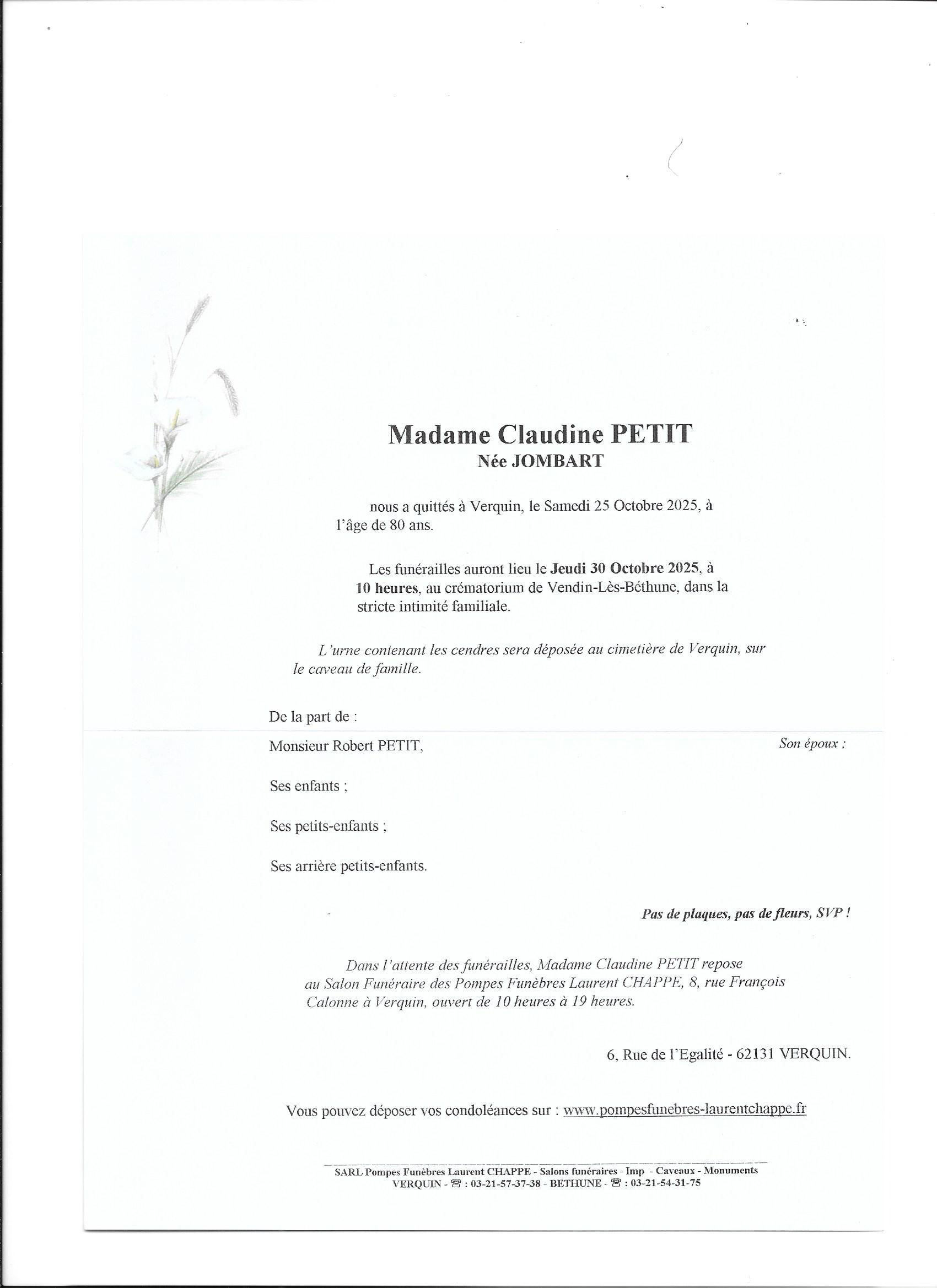 Mme Mejza et ses enfants vous adressent leurs plus sincères condoléances en regrettant de ne pas pouvoir participer aux obsèques de Claudine dont le souvenir restera gravé.