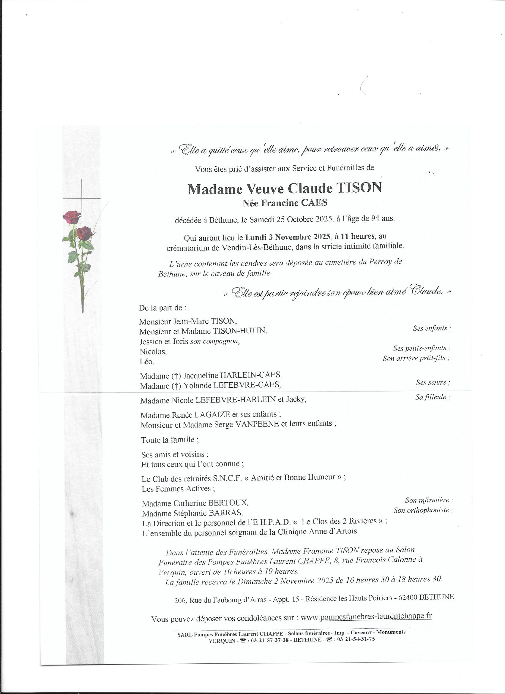 Par ces quelques mots et avec émotion, nous tenons à vous remercier de toute la sympathie que vous avez eu à l’égard de madameFrançine TISON-CAES