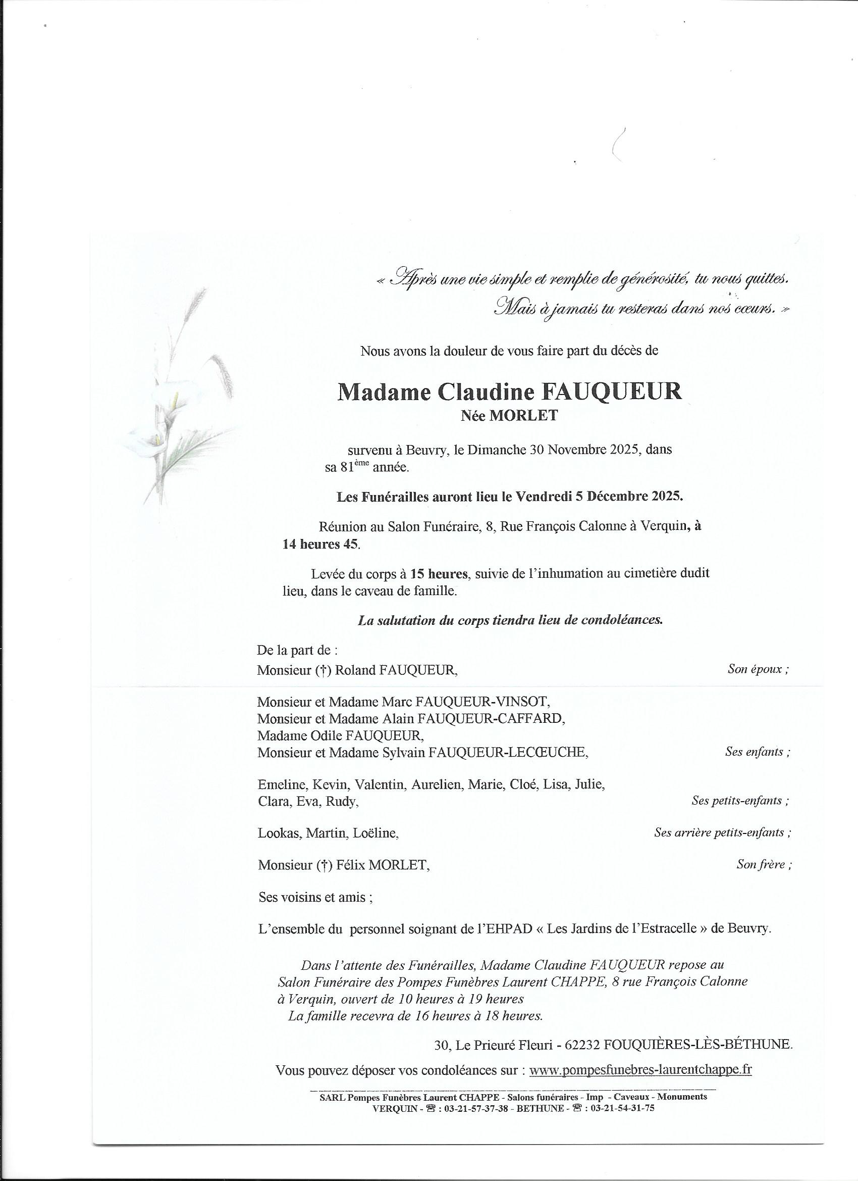 Madame le Maire de Verquin et l’ensemble du conseil municipal tenons par la présente à présenter nos sincères condoléances les plus sincères.