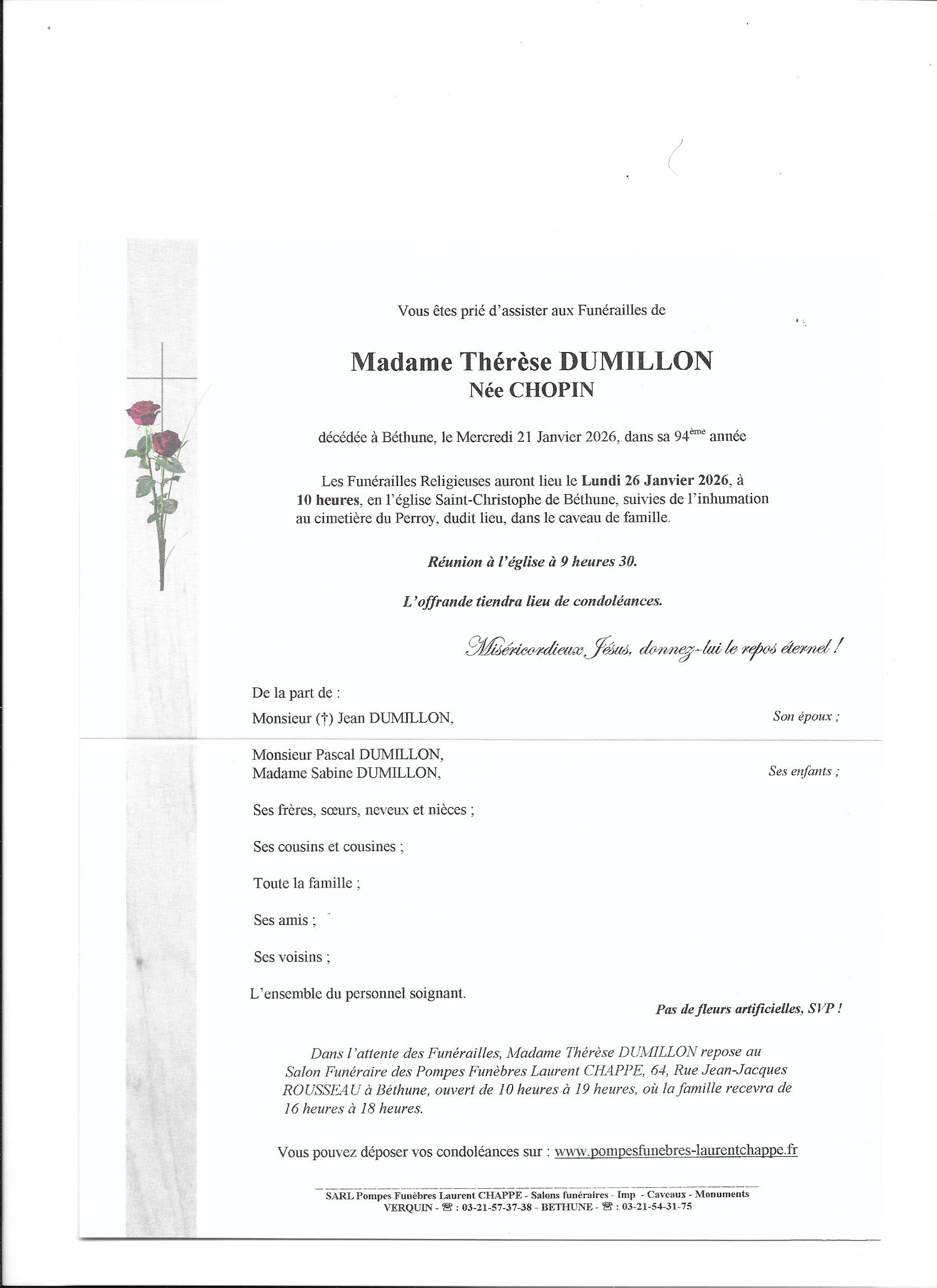Grignon odette sur 24 janvier 2026 à 8 h 52 min Nous présentons nos sincères condoléances à toute la famille .en particulier à Jacqueline. Michèle et Jacques.Maman er papa aiment beaucoup Therese et appréciaient beaucoup sa visite. Odette la fille d Arthur et Georgette Prudhomme à Bourthes. Réponse